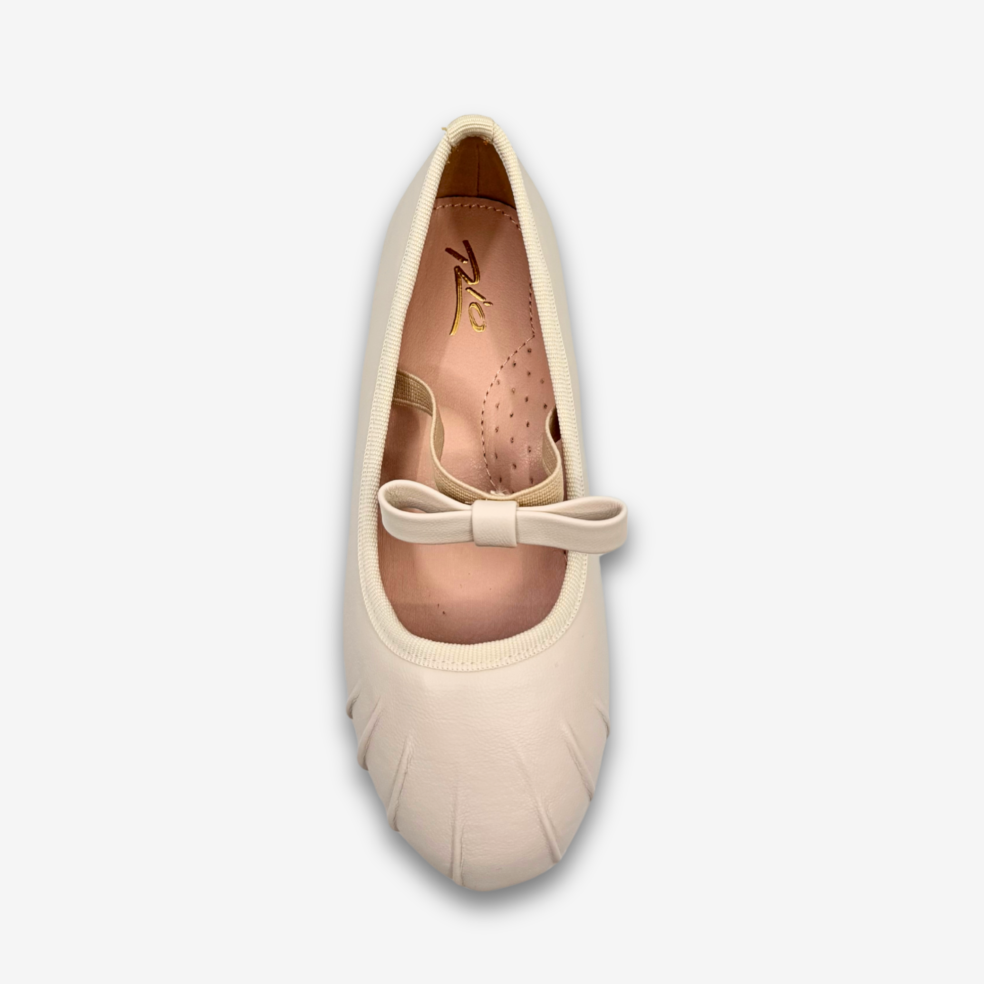 Designed for comfort with a polished touch, this RIO ballet flat features a rounded toe with subtle stitched pleats and a decorative bow across the top strap. The elastic strap provides a secure fit, while the cushioned perforated insole ensures breathability and ease. Ideal for casual wear, school days, or semi-formal outings.