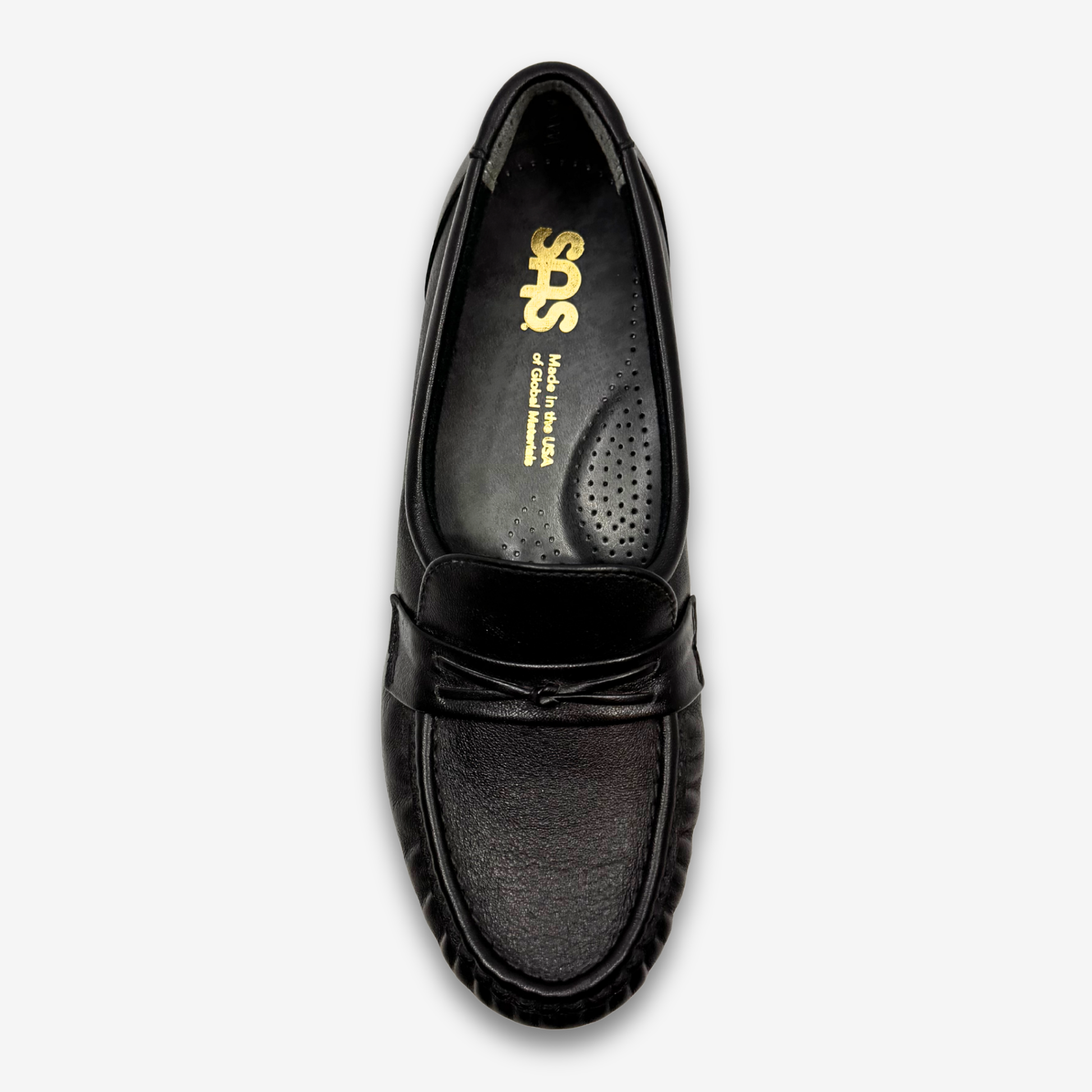 A decorative leather saddle adds flair to this genuine moccasin classic. A removable footbed cushions each step, while a hidden elastic panel stretches for an easy and secure fit. A stylized wedge heel offers stability.