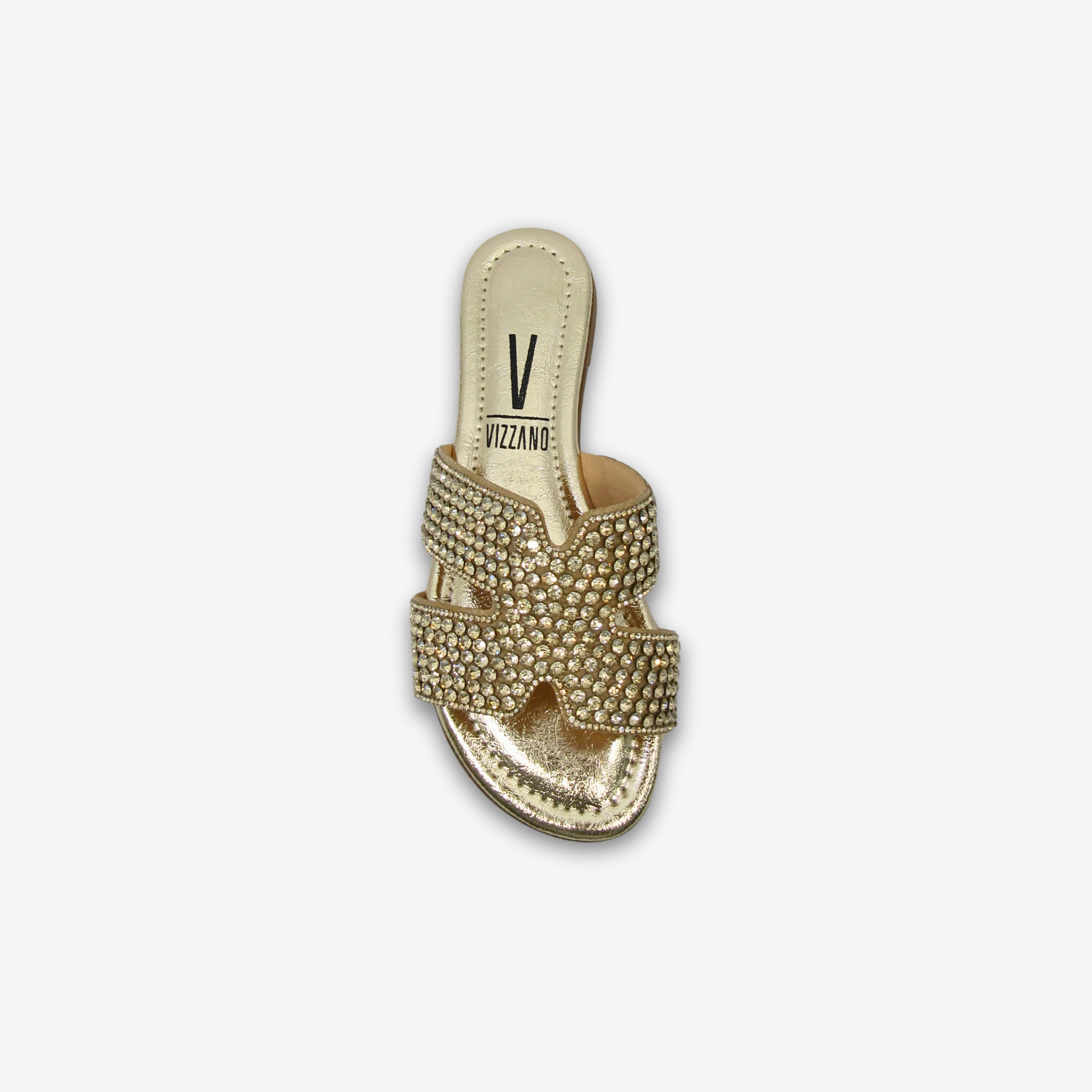 This VIZZANO women slipper is designed to combine elegance with convenience, making it perfect for dressy or festive occasions. Featuring a wide strap adorned with sparkling rhinestone embellishments in a decorative pattern, it delivers eye-catching style while ensuring a secure fit. The flat sole and cushioned footbed provide comfort for extended wear, while the slip-on construction offers effortless ease