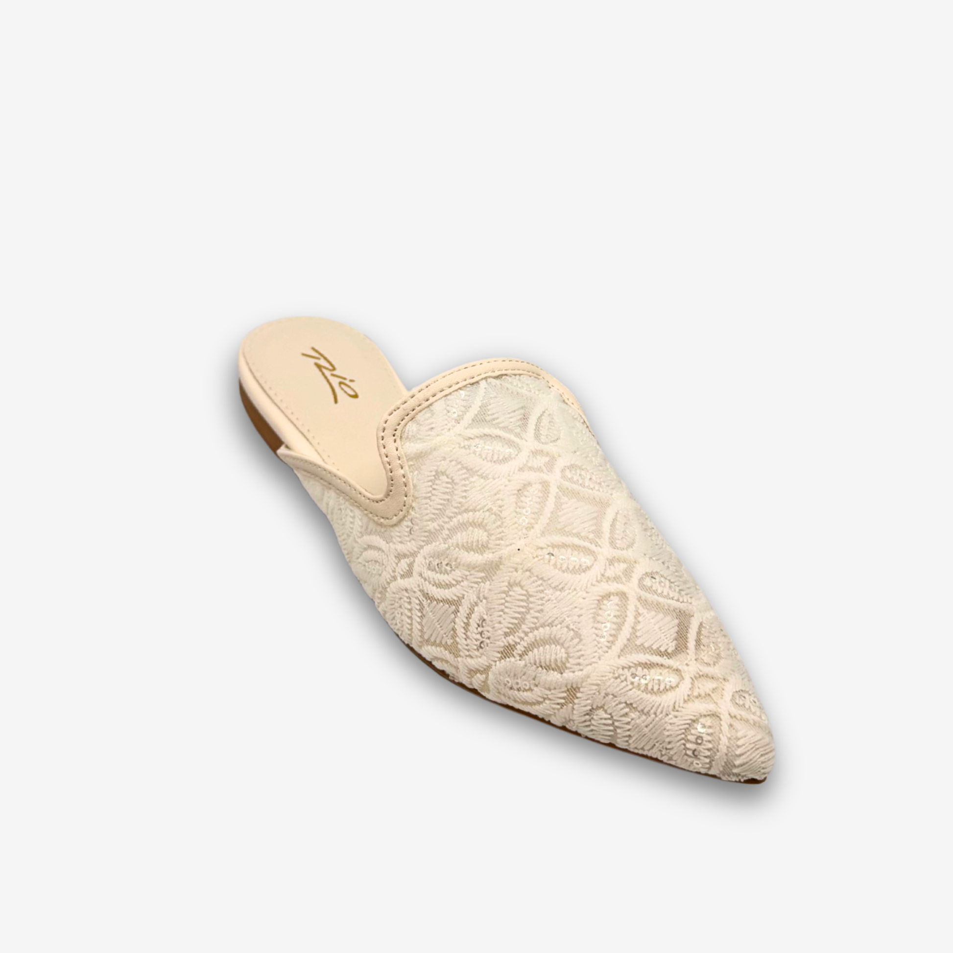 Elegant and easy, this slip-on mule from Rio features a pointed toe and intricate embroidery across a soft fabric upper. The low heel and cushioned insole offer all-day comfort, while the delicate detailing adds a refined touch. Ideal for casual chic looks or semi-formal occasions.
