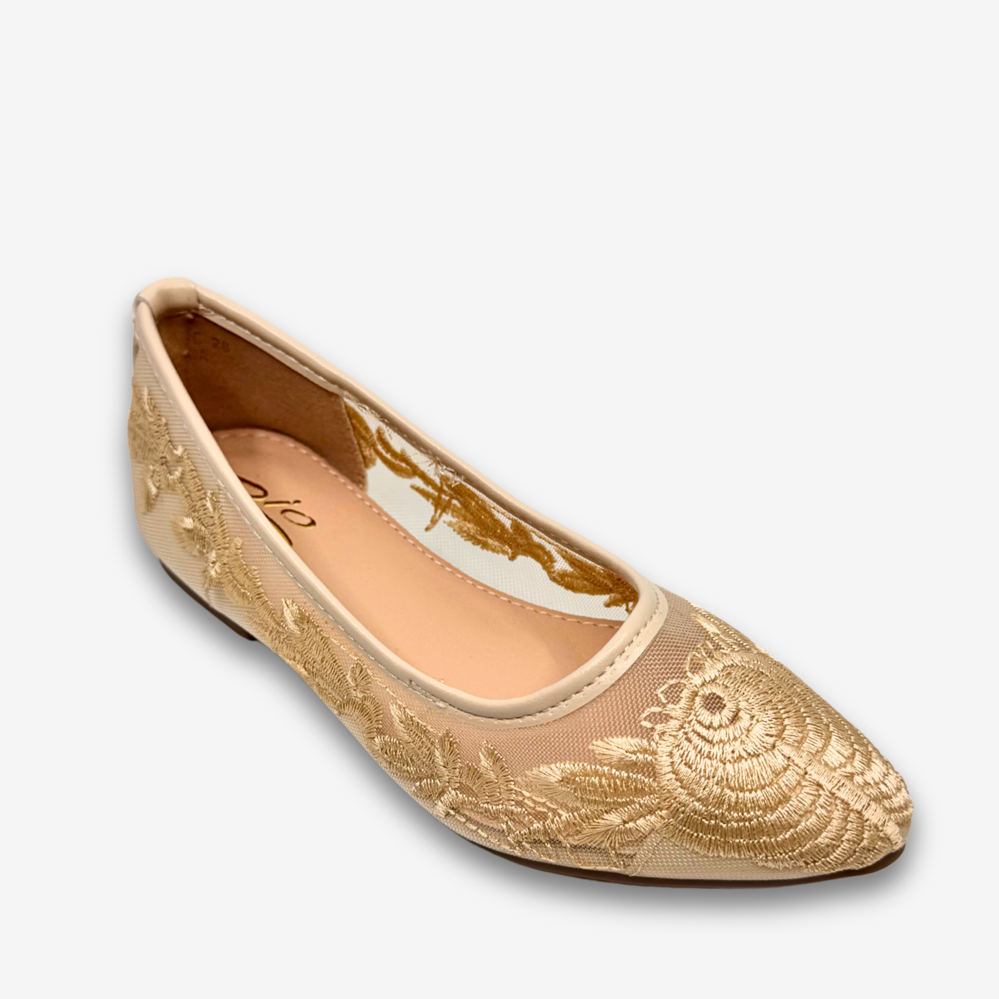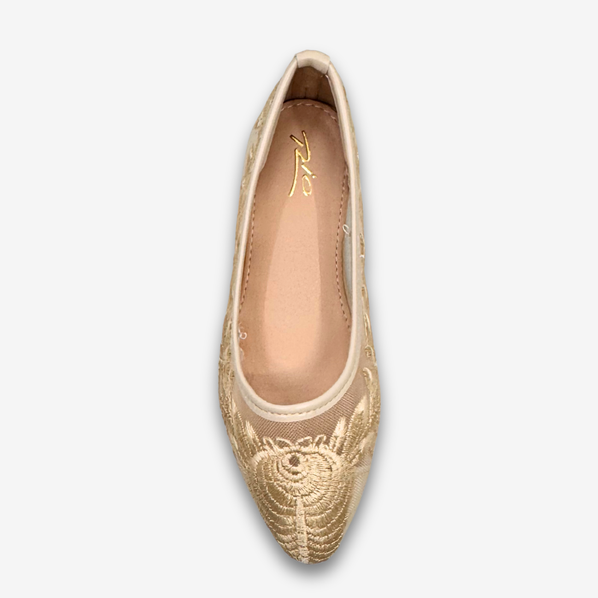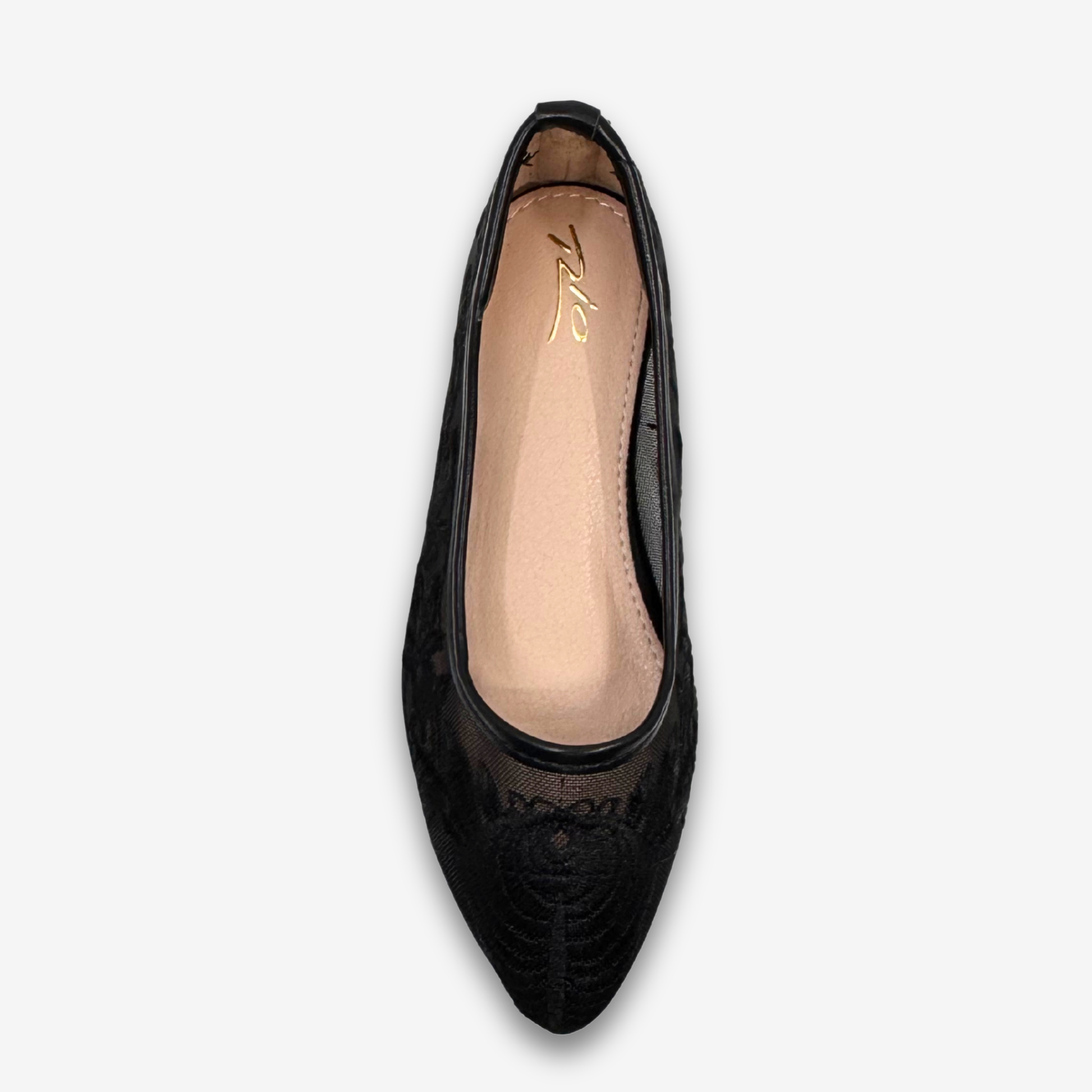 صُمم هذا الحذاء المسطح من ريو ببساطةٍ راقية، ويتميز بمقدمة مدببة ونعلٍ ناعم لراحةٍ تامة. الجزء العلوي من نسيج شبكي شفاف مُطرز بدقةٍ بنقوشٍ زهرية، مما يمنحه لمسةً نهائيةً خفيفة وأنيقة. نعلٌ داخلي مبطن يضمن الراحة، مما يجعله مثاليًا للمناسبات شبه الرسمية أو الإطلالات اليومية الأنيقة.