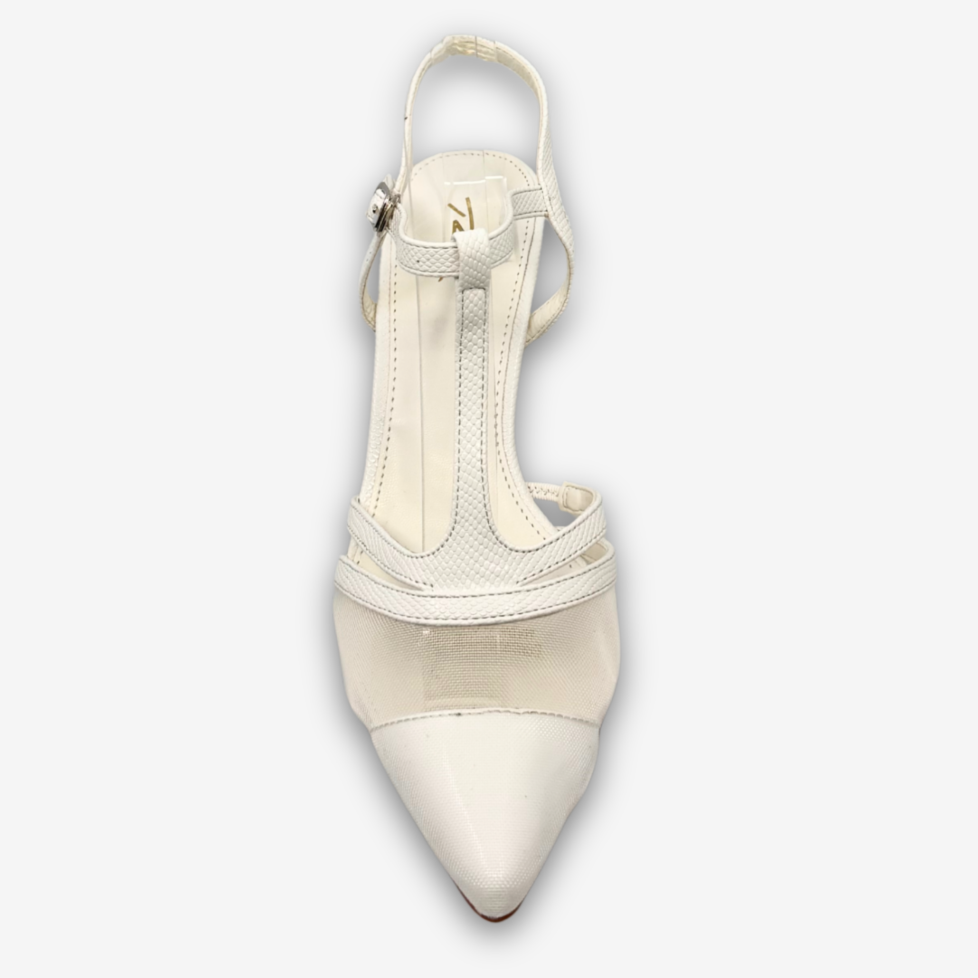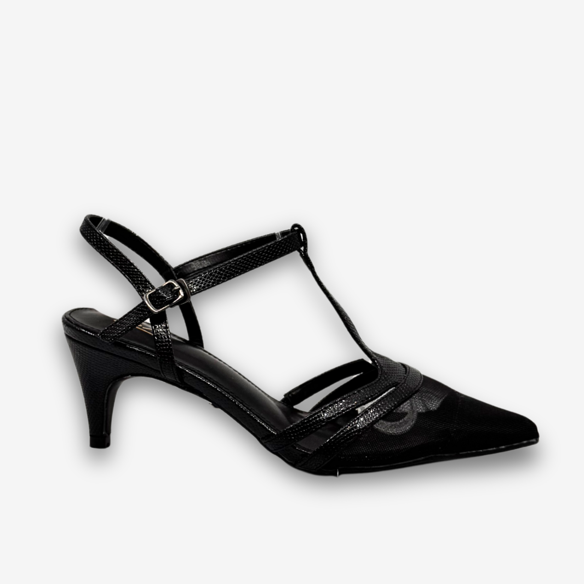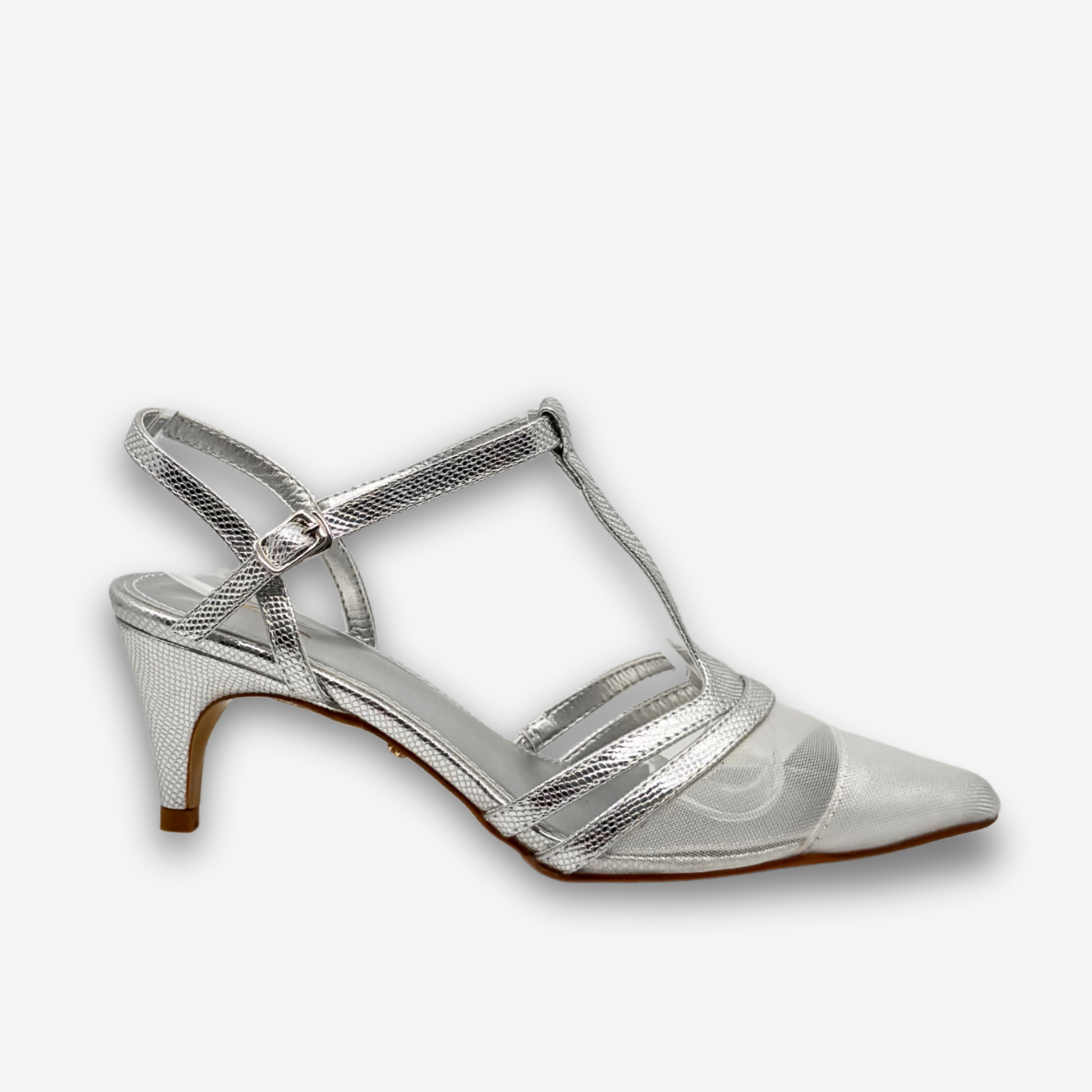 صُممت هذه الأحذية ذات الكعب العالي المدبب من ريو لتخطف الأنظار، فهي تتميز بجزء علوي من نسيج شبكي فضي لامع وأحزمة معدنية منقوشة بتصميم كلاسيكي على شكل حرف T. يضفي الكعب متوسط الارتفاع لمسة أنيقة، بينما يضمن الإبزيم الجانبي ثباتًا محكمًا. مثالية للمناسبات المسائية، والفعاليات الرسمية، أو أي مناسبة تتطلب لمسة من الفخامة.