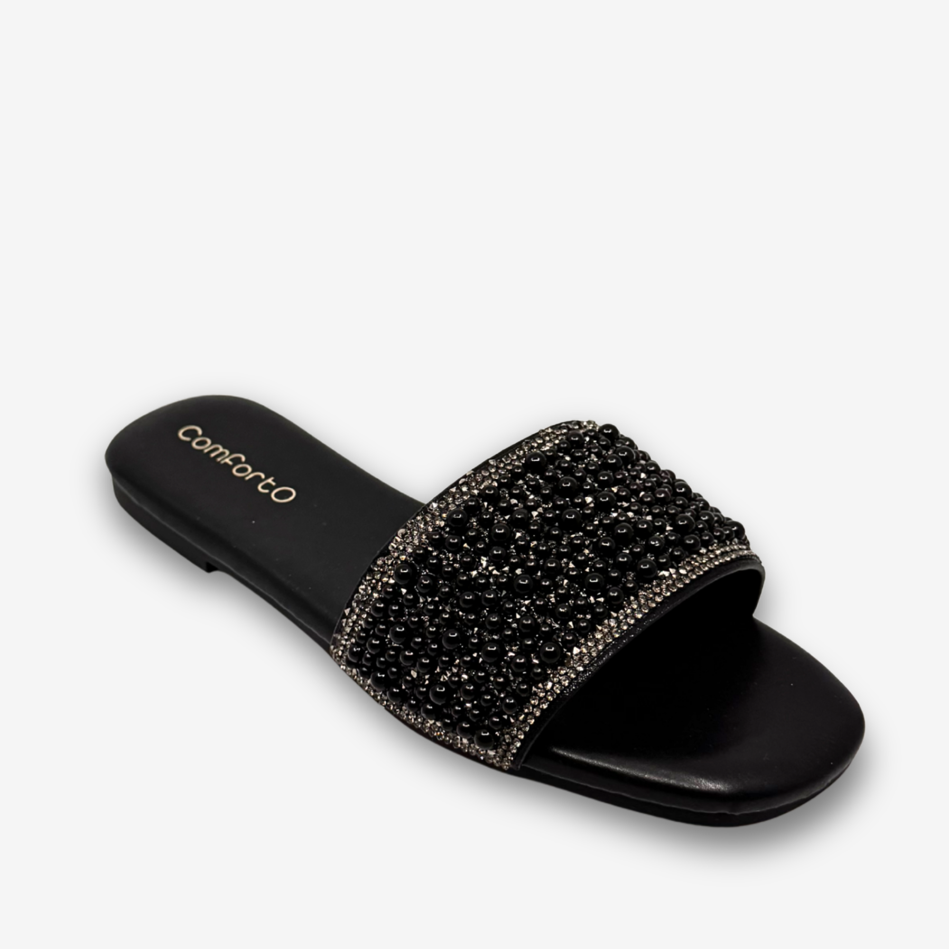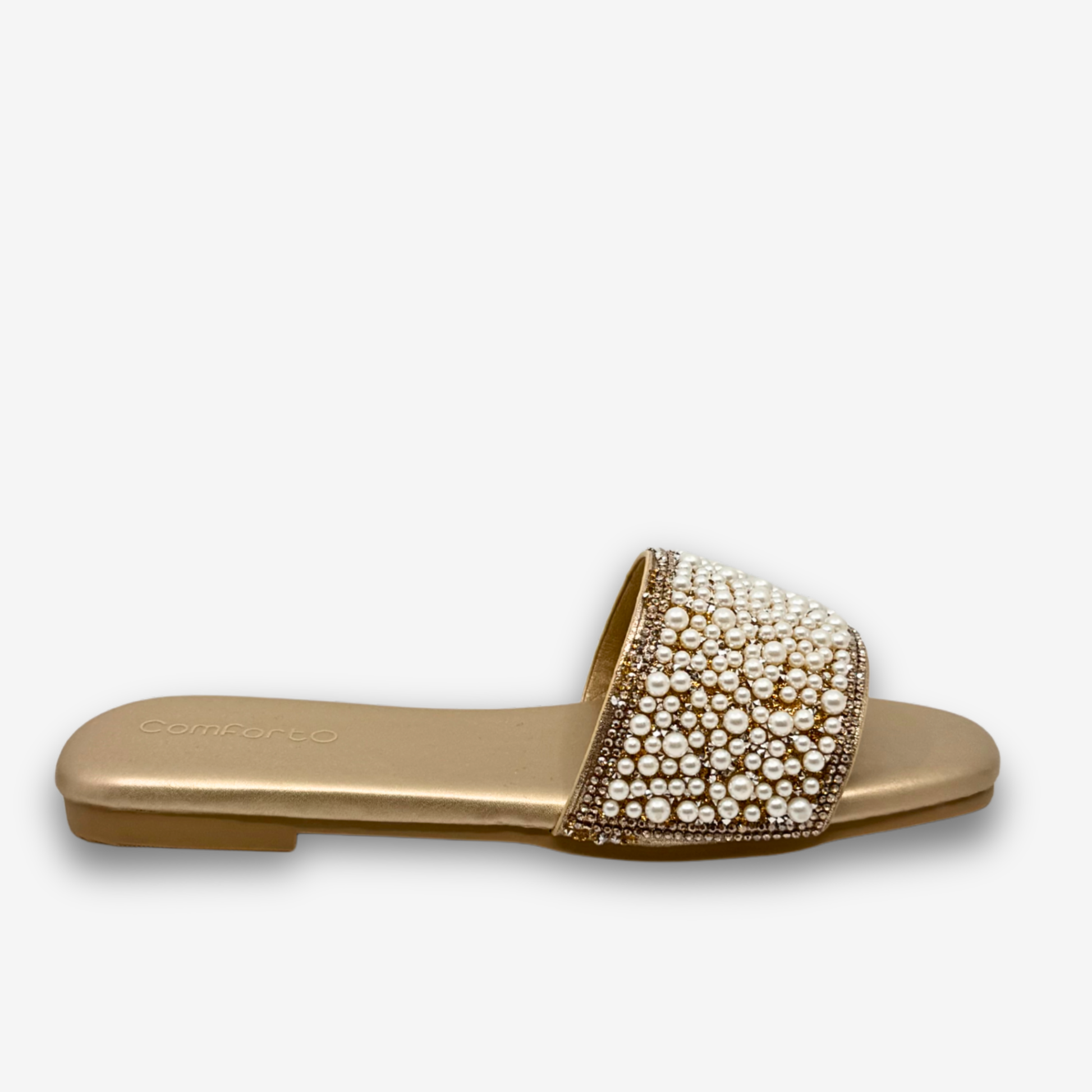 يتميز هذا الحذاء المسطح الأنيق والعملي من كومفورتو بحزام مزين باللؤلؤ فوق نعل داخلي معدني ناعم. صُمم هذا الحذاء ليجمع بين الراحة ولمسة من الأناقة، وهو خيار أنيق للمناسبات غير الرسمية، والتجمعات الاحتفالية، أو حتى السهرات المسائية المريحة.
