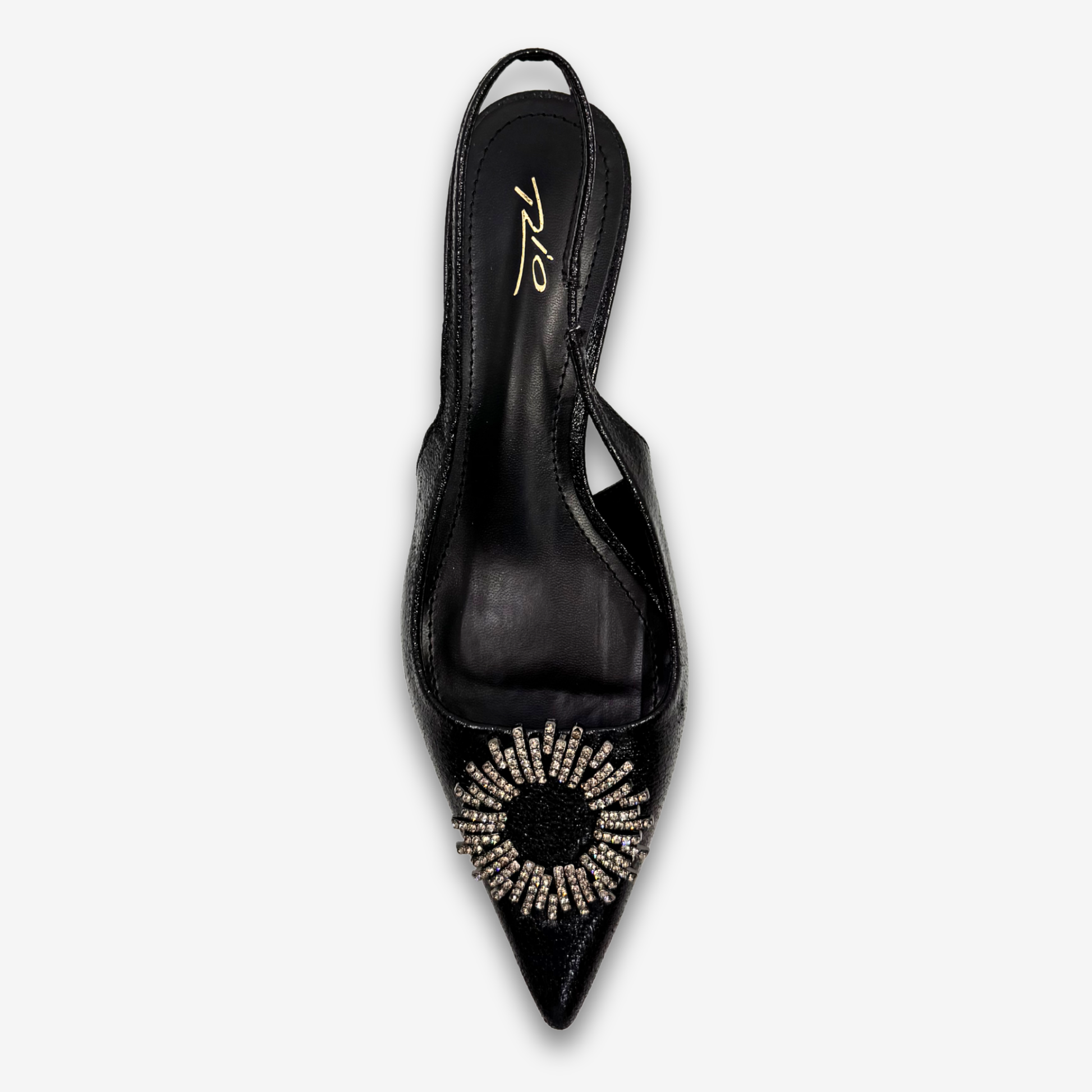 صُمم هذا الحذاء المفتوح من الخلف من ريو للمناسبات الراقية، ويتميز بمقدمة مدببة وكعب منخفض لمظهر أنيق وأنثوي. يُضفي تطريز أحجار الراين الدائرية لمسةً جذابةً على المقدمة، بينما يضمن الظهر المفتوح والحزام القابل للتعديل راحةً فائقة. يجعل النعل الداخلي المبطن واللمسة النهائية المصقولة هذا الحذاء مثاليًا للمناسبات الرسمية أو إطلالات النهار الأنيقة.